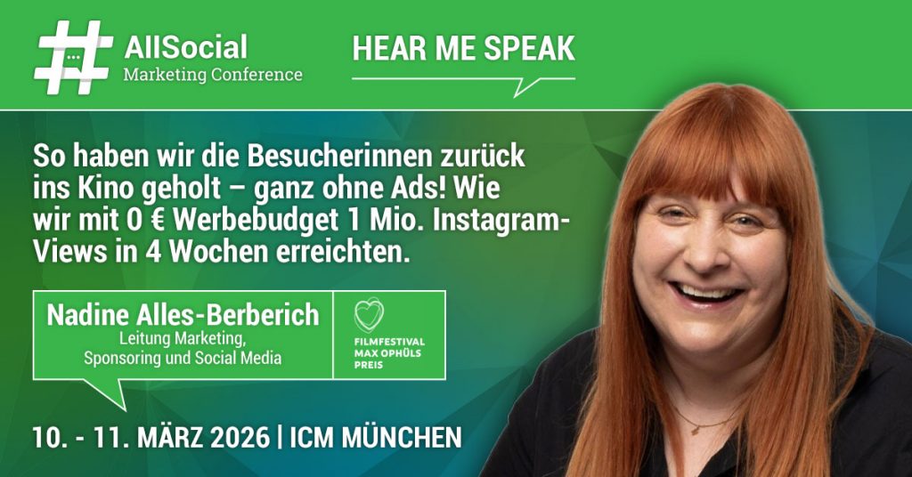 Kreativität schlägt Budget – das beweist Nadine Alles-Berberich auf der AllSocial Marketing Conference 2026. Die AllSocial gehört zu den renommiertesten Konferenzen im Bereich Social Media Marketing. Dort tritt sie als Speakerin auf.