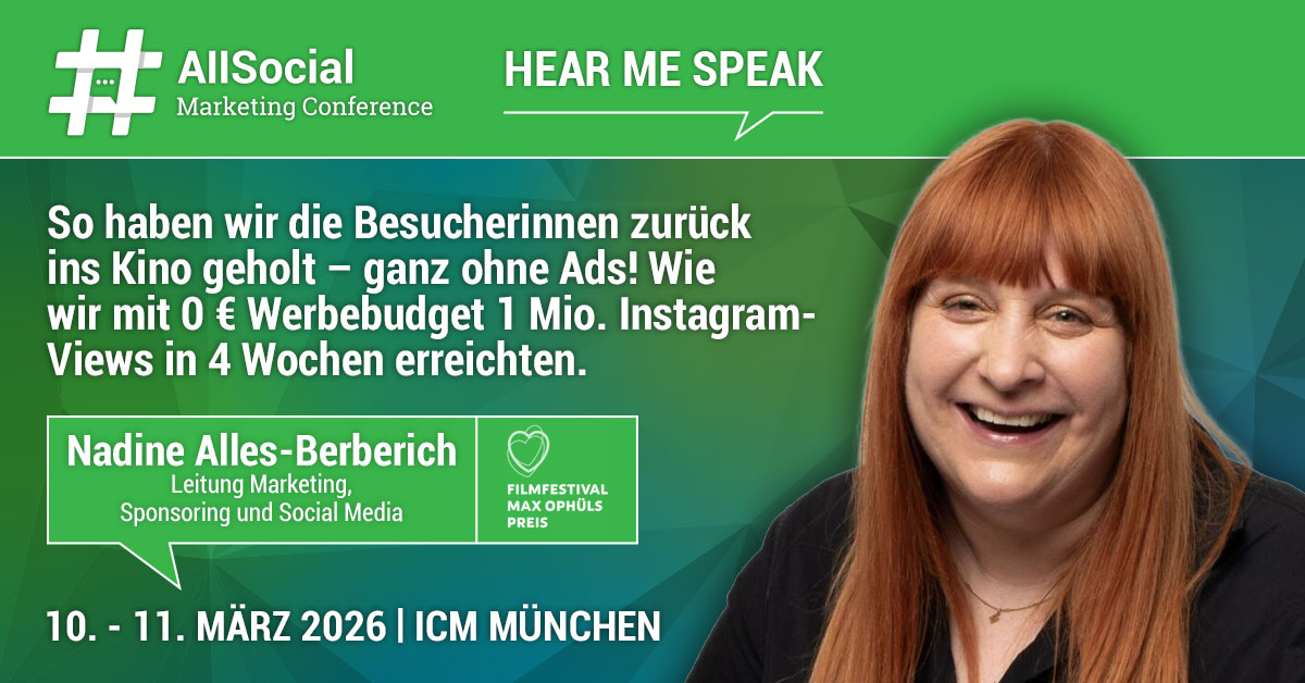 Kreativität schlägt Budget – das beweist Nadine Alles-Berberich auf der AllSocial Marketing Conference 2026. Die AllSocial gehört zu den renommiertesten Konferenzen im Bereich Social Media Marketing. Dort tritt sie als Speakerin auf.